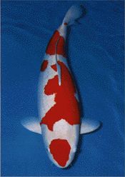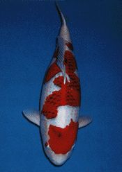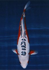 紅白はもっともポピュラーな種類です。「鯉は紅白に始まって紅白に終わる」という言葉があるとおり、基木中の基本に当たります。ほかの品種でもそうですが、紅白は体形、地肌、模様の三要素で見ます。白地は、ただ白いだけでなくテリがあるものが緋盤の赤さとマッチします。緋は、ピンク系や柿色系から仕上がって赤くなったもので、キワが良くムラなどない均一性のあるものがベターです。模様は同じものはひとつとしてありませんので、連続した一本緋のものや段物など好みの柄を楽しむことができます。