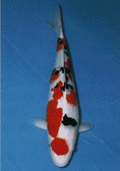 大正三色は紅白に墨が一色加わった品種です。「さんしょく」や「さんけ」などと呼ばれています。紅白と同じく、地体と緋は大切ですが、墨こそが大正三色の力です。黒々として、青味がかったツヤのある墨が望ましく、白地の中にくい込んだものが本物です。流行としては小さな墨の大正三色が上品だと言われますが、大きな墨の三色も魅力あります。とくに肩の墨は鑑賞のポイントになります。飼育しているうちに墨が浮いてくることがあります。これをアト墨と呼び、これも考えて選ぶとよいでしょう。