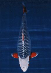 浅黄は、すべての錦鯉の原点に当たります。背が群青または水色で鱗1枚1枚に白くぼけた輪郭がついて、頭は白く抜けて、両頬・腹部・鰭の根元に緋模様があることが基本になります。この品種はとにもかくにも鱗並びが命で、きちんと並んだ鱗と背のブルーを楽しむ品種と言えます。